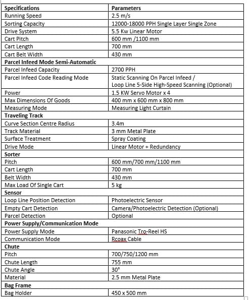 Sorting Sorter Carries Parcels To Right Destination (Chute) According To Barcode From Scanner. Collecting – Unique Chute Design Accurately Controls Out Feeding Position & Speed. Indicator Light With A Buzzer Turns On When A Container On Discharge Chute Becomes Full & Needs To Be Replaced.
